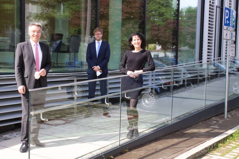 Bildtext: Beim Barrierefreien Bauen sollen Behörden Vorbild sein. Landrat Otto Lederer, Abteilungsleiter Quirin Zallinger und die Präsidentin der Bayerischen Architektenkammer Christine Degenhart an der Rampe, die zum Haupteingang des Rosenheimer Landratsamtes führt.