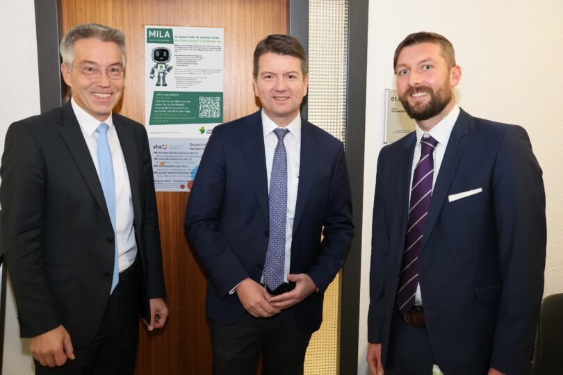 Landrat Otto Lederer (links) und der Leiter des Sachgebiets Ausländer- und Staatsangehörigkeitsrecht Daniel Herbert (rechts) erläuterten dem Bayerischen Innenstaatssekretär Sandro Kirchner (Mitte) erste Erfahrungen mit dem Chatbot MILA.