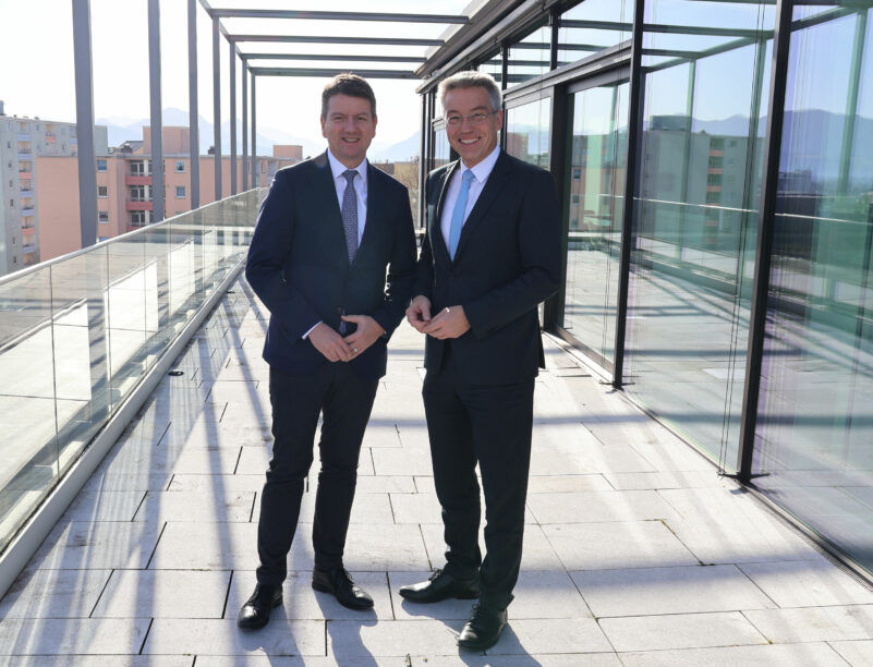 Der Bayerische Innenstaatssekretär Sandro Kirchner (links) informierte sich bei Landrat Otto Lederer (rechts) über eine erste Zwischenbilanz zum Chatbot MILA. Weitere Gesprächsthemen waren Herausforderungen und Fortschritte der Digitalisierung in der Behörde.
