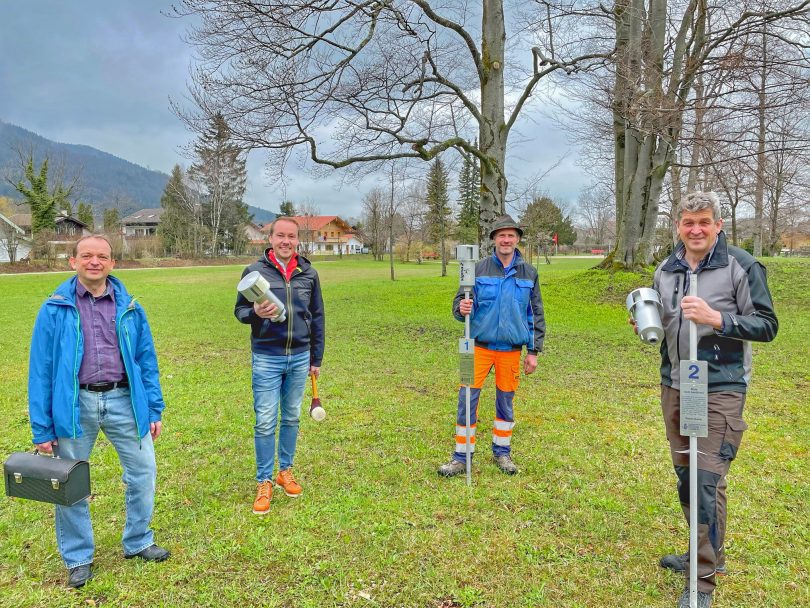 Guido Kugelmann (links) vom Deutschen Wetterdienst ist nun nach Aschau i.Chiemgau und die dazu erforderlichen Messvorrichtungen an Tourismuschef Herbert Reiter (Zweiter von links) zu übergeben. Wöchentlich werden nun Bauhofleiter Rudi Angermaier (rechts) und seinen Stellvertreter Sepp Feistl (Zweiter von rechts) die Messungen vor Ort vornehmen. Die Messvorrichtungen finden ihren Platz direkt vor dem Rathaus und der weitere Standort am Moor-Badeplatz. Die Erhöhung der Anteile Erneuerbarer Energieversorgung und der Elektromobilität im Ort stärken und erhalten dieses wertvolle Prädikat ebenfalls und sind somit Teil aktiver Maßnahmen zur Luftreinhaltung, so Klimaschutzmanager David Schmidtner.