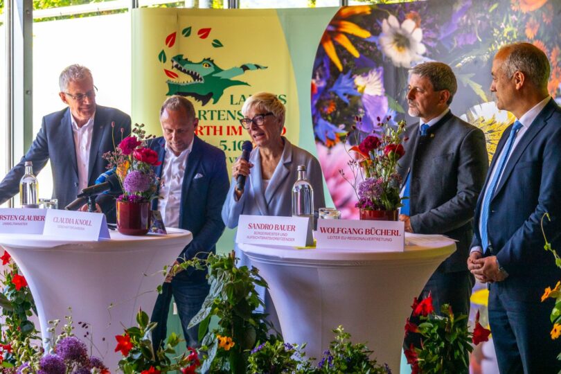 Spektakuläre Architektur, bunte Blumenpracht, Brücken, die verbinden und dazu strahlender Sonnenschein vom weiß-blauen Himmel – die Eröffnungspressekonferenz zur Landesgartenschau Furth im Wald 2025 war ein voller Erfolg. Journalistinnen und Journalisten aus ganz Bayern und aus dem benachbarten Tschechien bekamen Informationen aus erster Hand und wunderbare Motive für ihre Fotos und Filme. „Die stolze Stadt Furth im Wald zeigt sich in diesem Sommer mit einer Gartenschau am Wasser von ihrer schönsten Seite“, lobte Umweltminister Thorsten Glauber. Für ihn steht fest: „Furth wird 2025 zu einem touristischen Leuchtturm in der Oberpfalz.“ Bürgermeister Sandro Bauer legt die Messlatte noch höher: „Ein Leuchtturm in ganz Bayern“ ist sein Ziel.