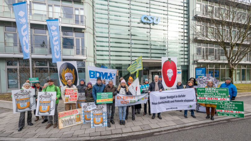 Delegierte eines breiten Bündnisses aus 18 Bauern-, Umwelt- und Verbraucherorganisationen forderten die CSU heute vor ihrer Parteizentrale auf, sich in Brüssel für gentechnikfreie und patentfreie Lebensmittel einzusetzen. Denn mit dem auf EU-Ebene geplanten Gesetz wäre es auch nicht mehr möglich, die Erzeugung von Saatgut oder die Herstellung von Lebensmitteln vor Gentechnik-Verunreinigungen zu schützen. Wir alle hätten keine Wahlfreiheit mehr, weder bei der Frage, wie wir Saatgut und Lebensmittel erzeugen, noch bei der Frage, was wir essen und trinken wollen. Außerdem würde ein aufgeweichtes EU-Gentechnik-Recht eine Flut von Patenten nach sich ziehen. Der freie Zugang zur genetischen Vielfalt würde weiter eingeschränkt, und die Landwirtschaft insgesamt in eine enorme Abhängigkeit gebracht.