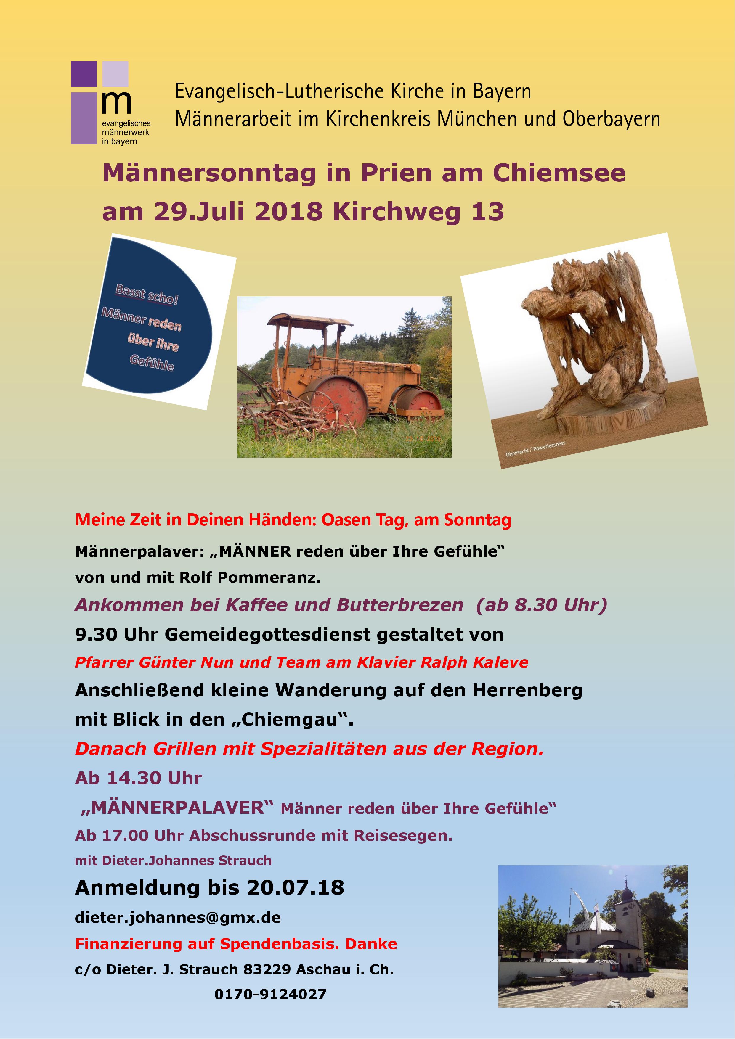 Die evangelische Männerwerk Bayern veranstaltet am 29. Juli in Prien am Chiemsee einen Männersonntag und lädt dazu recht herzlich ein. Die Programmpunkte lauten: