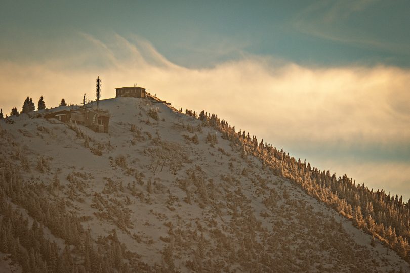 Schleierhaft oder besser märchenhaft erscheint bei dieser Aufnahme das Gipfelhaus der Alpenvereinssektion Rosenheim auf der Hochries. Während sich die Abendsonne neigt zeigen sich fast goldfarbene Berghänge und feines Gewölk zu einem Bildnis, wie es Künstler nicht besser malen könnten.