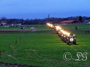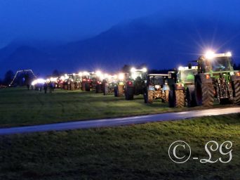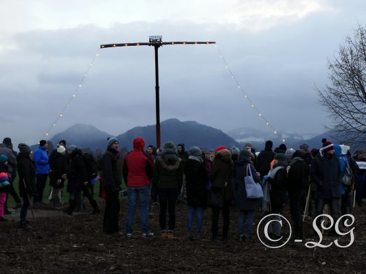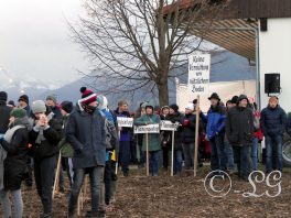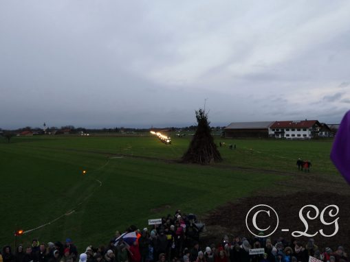 Hunderte Menschen, alle Generationen waren vertreten, haben sich am Sonntag Nachmittag auf den Weg in die Panger Felder gemacht um ihrem Protest gegen eine geplante Trasse für den Brenner Nordzulauf durch ihren Lebensraum Ausdruck zu verleihen. Initiiert hatte den Protest in Form eines Mahnfeuers die am 06. November gegründete Bürgerinitiative „Wasen nicht verBRENNERn“. Über 40 Traktoren, die entlang der durch Pfosten, Absperrbändern und Warnleuchten gekennzeichneten möglichen Trasse positioniert waren, beeindruckten die Bürger ebenso wie die 15 m hohe Lichterkette, die die Höhe der geplanten Brückenwerke darstellen sollte. Dass dies erst der Anfang des Protestes war, machten die Sprecher der BI Alexandra Linordner und Josef Gilg deutlich. „Unser oberstes Ziel ist der Zusammenschluss mit den andern Bürgerinitiativen um gemeinsam gegen dieses Wahnsinnsprojekt vorzugehen. Weder die Stadt noch der Landkreis Rosenheim werden in irgendeiner Weise von dem Projekt profitieren. Im Gegenteil, anstatt dass unsere Region vom Verkehr entlastet werden würde, befürchten wir einen weiteren Anstieg der Verkehre. Vor allem muss sich jetzt die Politik bewegen. Trassenpläne, die bereits 30 Jahre oder älter sind jetzt durchzusetzen, wo mittlerweile das Inntal dichtest besiedelt ist halten wir für unvorstellbar und fordern deshalb den absoluten Planungstopp!“