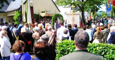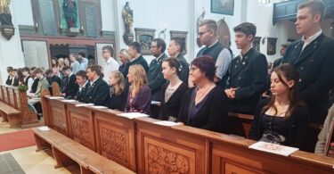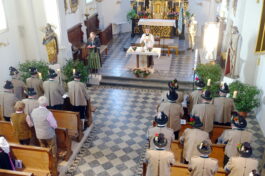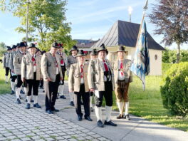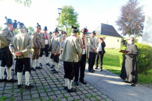 Pfarrer Josef Steindlmüller, selbst aus St. Salvator stammend, freute sich über die schöne Glaubens- und Traditionspflege und über das starke Ausrücken der Kompanie. „Bei der Taufe wurden wir bereits auf den Namen der Dreifaltigkeit getauft. Nun ist es wichtig, was wir selbst daraus machen. Sagen wir zueinander und im Alltag JA so wie es Maria zu ihrem Sohn Jesus gesagt hat“ – so der Kompaniepfarrer. Hauptmann Sepp Kirner sagte seinerseits Danke dem Pfarrer, dem Bläserduo Irmi und Ludwig Scheck aus den eigenen Reihen sowie der Ehren-Kompaniemarketenderin Gertrud Heider für die Vorbereitung der Maiandacht am Dreifaltigkeitstag in St. Salvator.