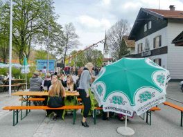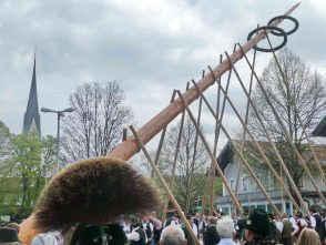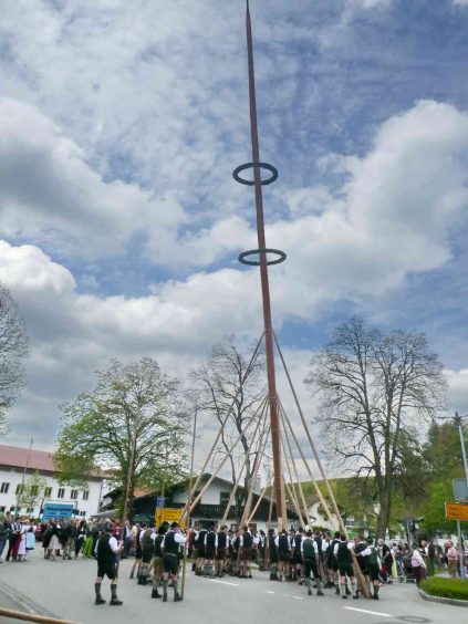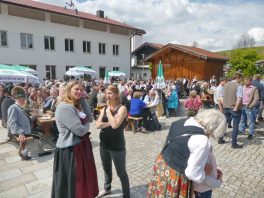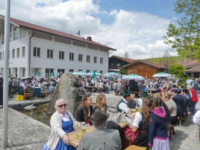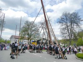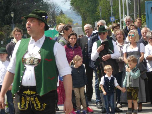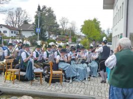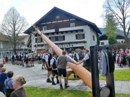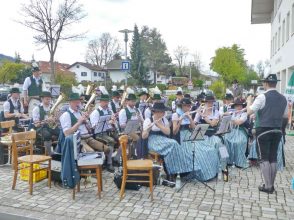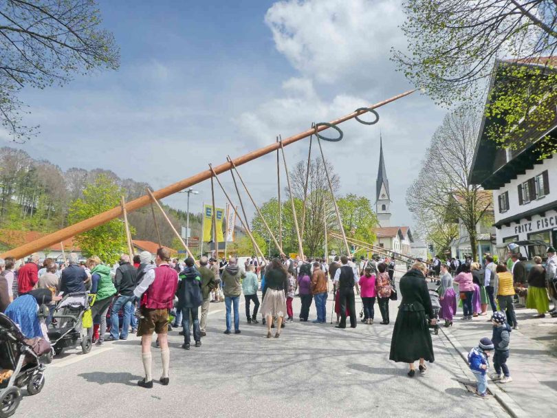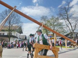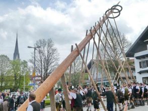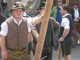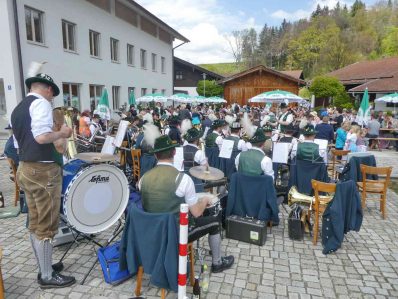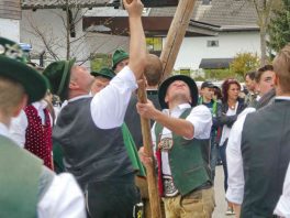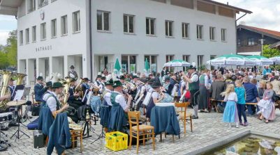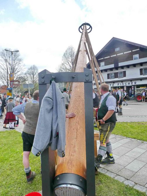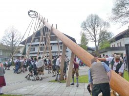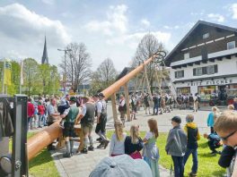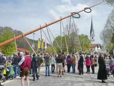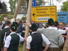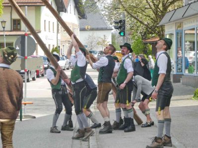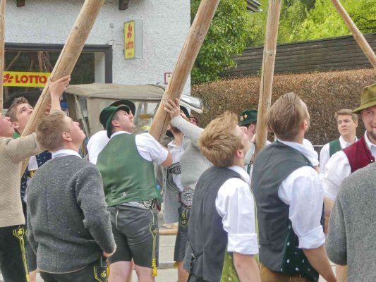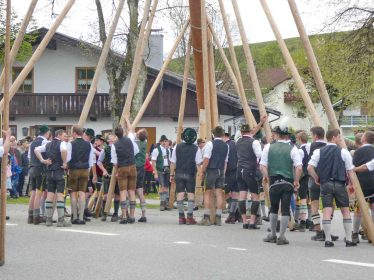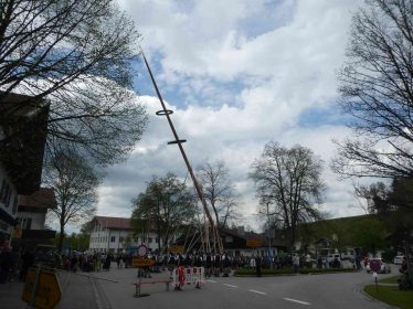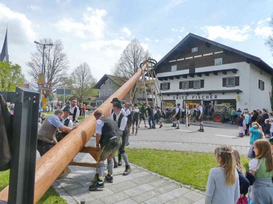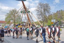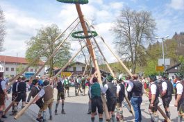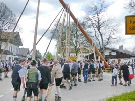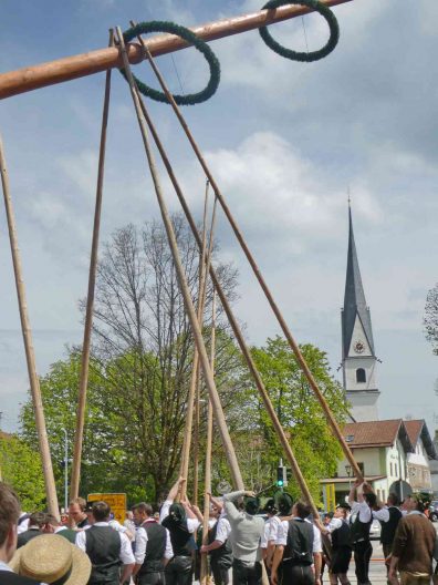 Mit so vielen Schauwilligen und Leuten, die in gemütlicher Atmosphäre das Maibaumaufstellen in Frasdorf genießen wollten, hatte der Trachtenverein “Lamstoana” Frasdorf nicht gerechnet. Vor der Lamstoahalle und auf dem Platz zum Rathaus war letztlich jeder Platz gefüllt und so entwickelte sich das Aufstellen des 28 Meter langen Baumes zu einem richtigen Dorffest. Hierzu trug auch die Wildenwarter Blaskapelle mit ihren Unterhaltungsweisen bei.