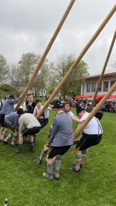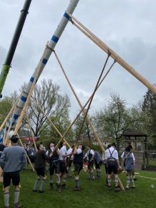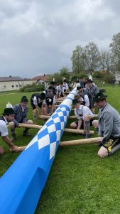 Salutschüsse, Auftakt der Söchtenauer Blasmusik und los marschiert. Trotz der eher mäßigen Wettervorhersage haben die Pruttinger Trachtler und die Landjugend dem Wetter getrotzt. Unter der Leitung von Christoph und Christian Kaffl wurde der 26,5m lange Maibaum in die Ortsmitte gebracht und mit purer Manneskraft aufgestellt.