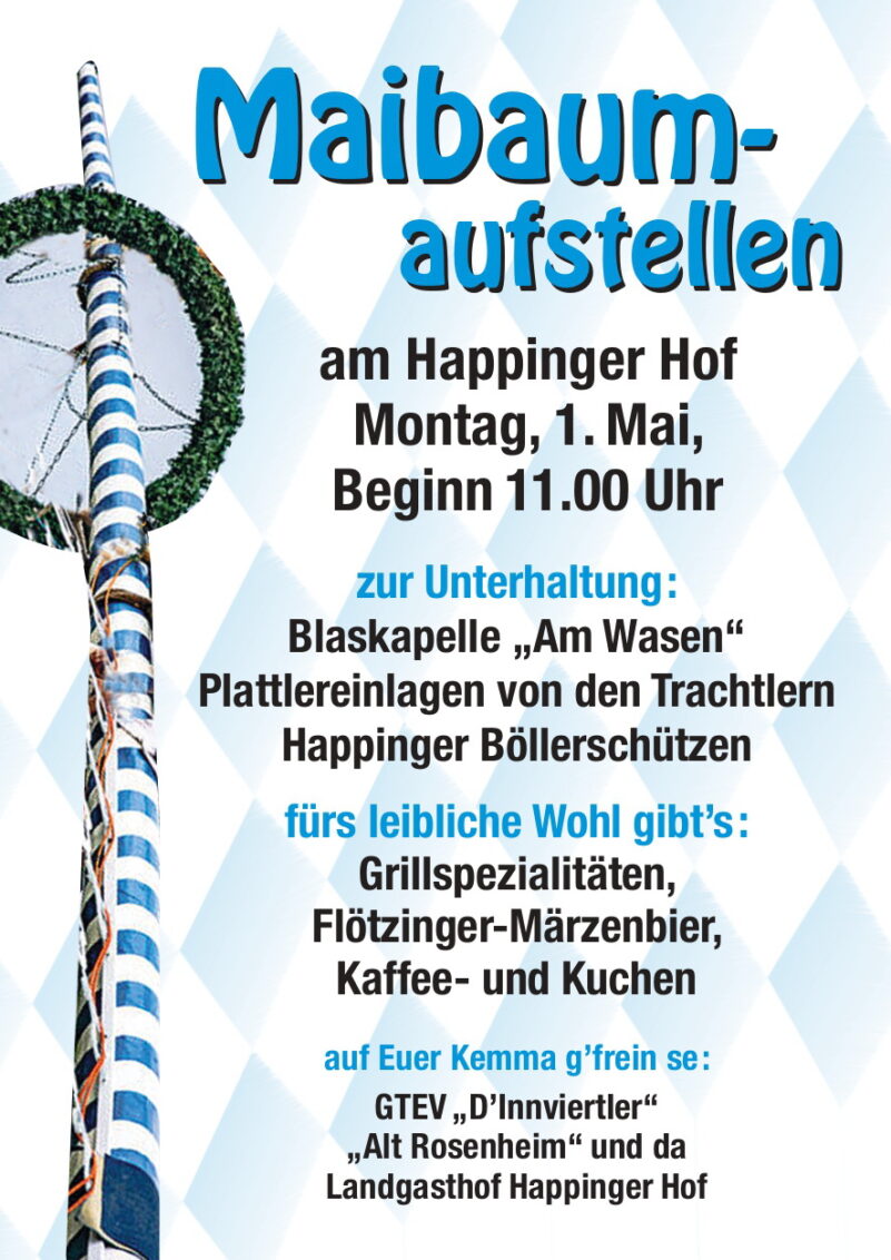 Im Rosenheimer Ortsteil Happing wird am 1. Mai wieder ein Maibaum aufgestellt. Mit Böllerschüssen und Blasmusikklängen erfolgt ab 11 Uhr der feierliche Einzug des Maibaums, der im Wirtsgarten des „Happinger Hofs“ mit viel Muskelkraft durch die Rosenheimer Trachtler und Happinger Ortsvereine aufgestellt wird.