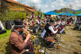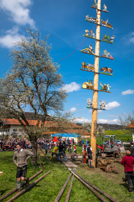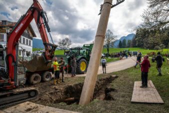 Seit Jahrzehnten wird in Roßholzen vom dortigen Trachtenverein „Almenrausch“ der Maibaum ganz traditionell mit Händen und Stangen gestemmt. – In diesem Jahr war dies aufgrund der sehr starken Regenfälle der vergangenen Wochen nicht möglich. Das Erdreich war zu nass und rutschte nach. Das machte ein Aufstellen mit Manneskraft unmöglich. Stattdessen musste man das Erdreich mit Kies stabilisieren und konnte den Baum nur mit einem Kran sicher und stabil aufrichten. Trotz der schwierigen Bodenverhältnisse stand der Maibaum in Rossholzen am Ende prachtvoll da. Er ist 34,7 m lang und wurde 3,5 m in die Erde eingelassen. Es war ein großartiges Fest für die Dorfgemeinschaft mit gutem Essen und musikalischer Begleitung durch Mitglieder der Musikkapelle Samerberg. Gestiftet wurde der prächtige Baum heuer von Maria und Florian Griebl aus Achtental am Samerberg.
