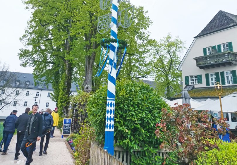 Auf der Insel angekommen, brachte man den aufwendig hergerichteten Maibaum zum Vorplatz vom Hotel zur Linde und machte sich daran, den zehn Meter hohen Baum mittels „Schwaiberl“ – verschieden lange Holzstangen, die an einem Ende mit Schüren verbunden sind – in die Vertikale zu bringen. Das sich der Vorgang stundenlang hinziehen kann, ist nicht verwunderlich, müssen ja ständig die teils meterlangen schweren Stangenpaare gewechselt werden, erklären die Protagonisten.