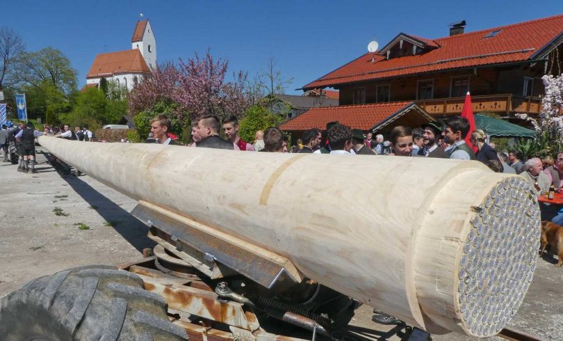 32 Meter lang und viereinhalb Tonnen schwer war der Maibaum, den Franz Daxlberger aus Kohlgrub gestiftet hatte und den die Mitglieder der Jungbauernschaft nach Stephanskirchen entführt hatten. Seit der Zeit des „Diebstahls“ lernten sich die Männer und Burschen von Grainbach und Stephanskirchen bei zwei Grillfeierlichkeiten näher kennen und dabei vereinbarten sie, das gemeinsame Vorbereiten und Aufstellen des Baumes. In Grainbach waren die örtliche Feuerwehr und der Trachtenverein Hochries-Samerberg gemeinsame Veranstalter des Festes und zusammen mit dem Wirt vom Gasthof Maurer sorgten sie auch für ausreichend Plätze und Bewirtung. Mit vereinten Kräften und mit Sicherungs-Unterstützung eines Kranes gingen die Männer an die Arbeit und hörten dabei auf das Kommando von Zweiten Trachtenvorstand Peter Sattlberger. Erster Trachten-Vorstand Fred Wiesholzer sowie Vorstand Albert Auer und Kommandant Bernhard Irger handelten nach dem Eintreffen des Baumes, der mit zwei Rössern in das Dorf gebracht wurde, aus, dass alle beim Aufstellen Helfenden eine Brotzeit und eine Maß Bier bekommen. Für die aus Stephanskirchen mitgereisten Dirndl wurden separate Getränke vereinbart. Bei herrlichstem Wetter und überaus vielen Zuschauern ging die Aufstellung auf dem Wirtshausplatz mit Blick auf die Ortskirche bestens vonstatten. Für die musikalische Unterhaltung sorgte die Musikkapelle Samerberg unter der Leitung von Benedikt Paul, die Jugend des Trachtenvereins zeigte sich nach dem Aufstellen mit Plattler- und Tanzeinlagen.