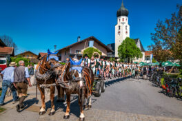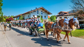 Bereits am Vormittag rollte der 30 Meter lange Maibaum, festlich geschmückt, durch die Straßen – gezogen von einem prächtigen Pferdegespann unter der Führung von Florian Wörndl. Auf dem Maibaum sitzend: die jungen Dirndl und Buben des Trachtenvereins Almarausch Hittenkirchen, in Tracht, mit Stolz und Freude im Gesicht. Der Baum selbst war eine Spende der Familie Weinberger aus Schaurain – ein Geschenk an die Dorfgemeinschaft, das von Anfang an sinnbildlich für den Zusammenhalt stand.