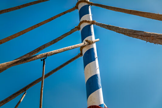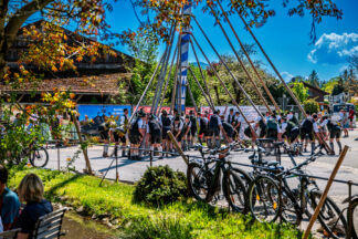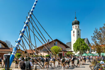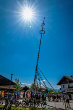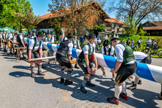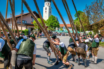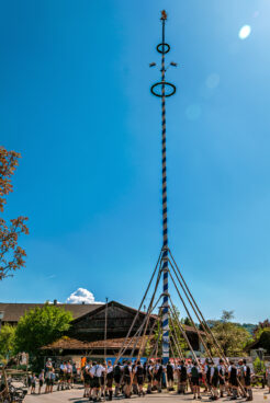 Das Aufstellen selbst war ein Höhepunkt bayerischer Festkultur: Mit vereinten Kräften und reiner Muskelkraft wurde der Maibaum mit traditionellen „Schwaiberln“ in die Senkrechte gehievt – zentimeterweise, unter klaren Kommandos, mit viel Geschick und noch mehr Schweiß. Dabei kam selbstverständlich kein Kran zum Einsatz – der Baum wurde „richtig echt“ aufgestellt. Die abschließende Verschraubung übernahm ein eingespieltes Team mit schwerem Gerät und routiniertem Blick.