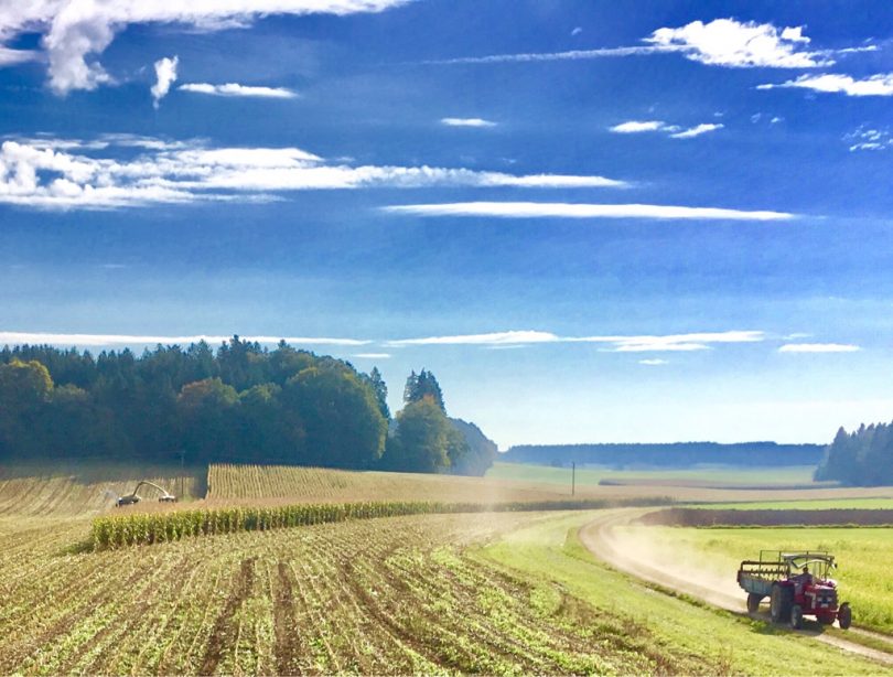 Eine der letzten Erntearbeiten auf den heimischen Feldern ist die Mais-Ernte. Dabei ergeben sich gerade in Zeiten herbstfarbener Landschaften schöne Bilder – davon diese aktuellen Eindrücke aus der Nähe von Pittenhart im Chiemgau.