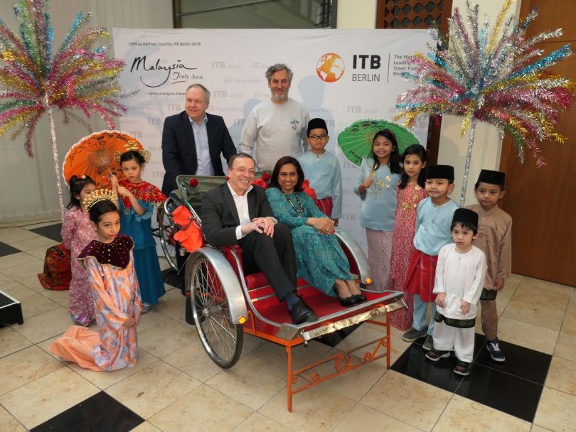 Ein Fototermin rundete die Pressekonferenz ab. Dabei zeigten sich die Botschafterin Datin Sarah Albakri Devadason und Dr. Martin Buck, Senior Vice President Travel & Logistics Messe Berlin, in einer traditionellen Fahrrad-Rikscha umrahmt von Kindern in traditioneller bunter malaysischen Kleidung.