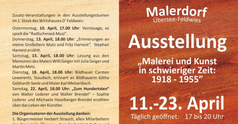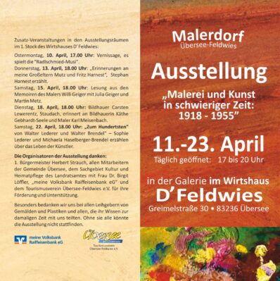 Gesprächsrunden und Lesungen werden das Leben einzelner Künstlerpersönlichkeiten besonders beleuchten: Donnerstag, 13.4. um 18 Uhr erzählt Enkel Stephan Harnest vom Leben und Werken seiner Großeltern, am Samstag, den 15.4. um 18.00 Uhr erinnert Julia Geiger und Martin Metz mit einer Lesung aus den Lebenserinnerungen von Willi Geiger, am Dienstag, den 18.4. um 18 Uhr beleuchtet Carsten Lewerentz das Schaffen von Karl Meisenbach und Käthe Seele und am Samstag, den 22.4. um 18 Uhr gedenkt man Walter Lederer und Walter Brendel, die heuer 100 Jahre alt geworden wären. Mit dabei sind Sophie Lederer als Ehefrau Lederers und Michaela Haslberger als Tochter Brendels.
