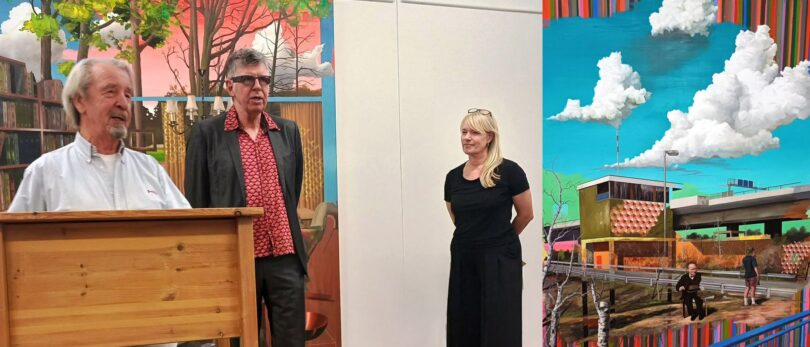 Hermann Reimer, 1959 im westfälischen Münster geboren, zeigt eine große Anzahl seiner – auf den ersten Blick – gegenständlichen Malerei, die jedoch beim genaueren Betrachten der Raum- und Landschaftssituationen verstörend surreal wirken und Spielraum für die interessantesten Geschichten eröffnen. Kurator Rudolph Distler am Stehpult eröffnete die Ausstellung vor einem der Gemälde des Künstlers Hermann Reimer. Daneben die Kunsthistorikerin Andrea Kühnhackl, die bei der Vernissage ein Gespräch mit dem Künstler führte (ausführlicher Bericht folgt).