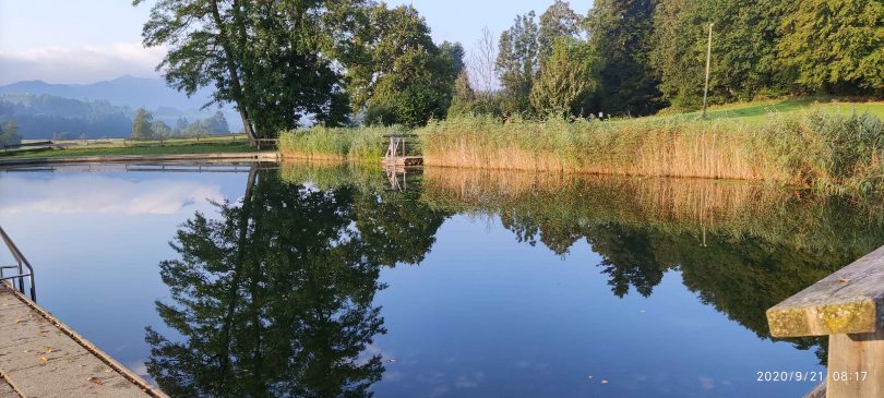 Auch wenn für die meisten Leute das sommerliche Baden schon vorbei ist, kann man sich noch an den Schönheiten der Badeplätze oder Freibäder erfreuen – wie diese aktuellen Aufnahmen vom Naturbad Samerberg nahe der Samerberger Filze zwischen den Orten Grainbach und Törwang zeigen. Dabei spiegelt sich die malerische Landschaft zu Füßen der Hochries im vollkommen  ruhigen Wasser und erzeugt zusätzliche Betrachtungs-Reize.