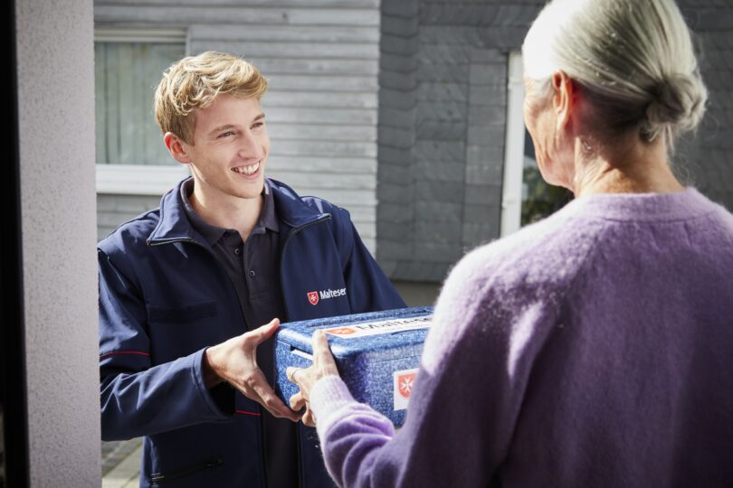 Bild 2: Ein leckeres warmes Mittagsmenü, ein Lächeln und ein paar nette Worte – der Besuch vom Malteser Menüservice-Mitarbeiter ist für viele ältere Menschen auch ein wichtiger sozialer Kontakt.