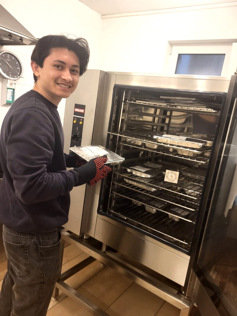 Bild 1: Fünf Gerichte stehen täglich zur Auswahl – die Bestellungen werden von Michael Stuffer von den Rosenheimer Maltesern im Ofen in Flintsbach schonend fertiggart. (Foto: Malteser)