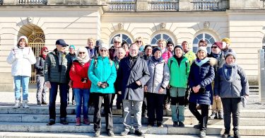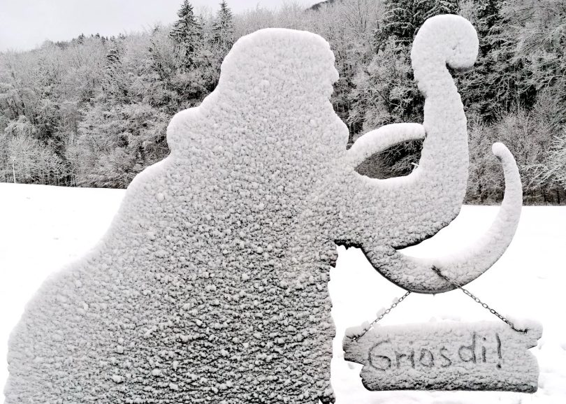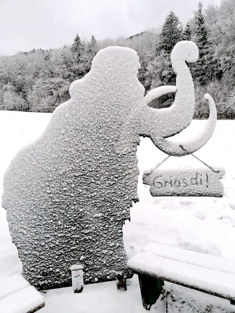 Ruhig und leicht vom jüngsten Schnee bezuckert grüßt auf dem westlichen Höhenweg in Aschau i. Chiemgau der dort für Siegsdorf werbende Mammut. Damit trägt das Mammut zu einer freundlichen Spaziergänger-Begegnung bei.