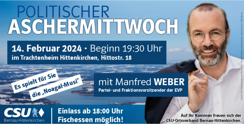 Der CSU Ortsverband Bernau-Hittenkirchen freut sich, den diesjährigen Politischen Aschermittwoch anzukündigen, der am 14. Februar 2024 stattfinden wird. Die Veranstaltung beginnt um 19:30 Uhr, der Einlass ist ab 18:00 Uhr möglich. Als Highlight des Abends wird der Partei- und Fraktionsvorsitzende der EVP, Manfred Weber, der die Herausforderungen Europas als Wirtschafts- und Wertegemeinschaft herausstellt, erwartet. Er redet Klartext zu einer möglichen Wahl von Donald Trump in USA, als auch zum wirtschaftlichen Einfluss Chinas auf die deutsche Wirtschaft.
