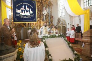 bmann Georg Huber (Steinkirchen) präsentierte beim Festgottesdienst die zusammengesteckte Standarte der Kirchenbesucher