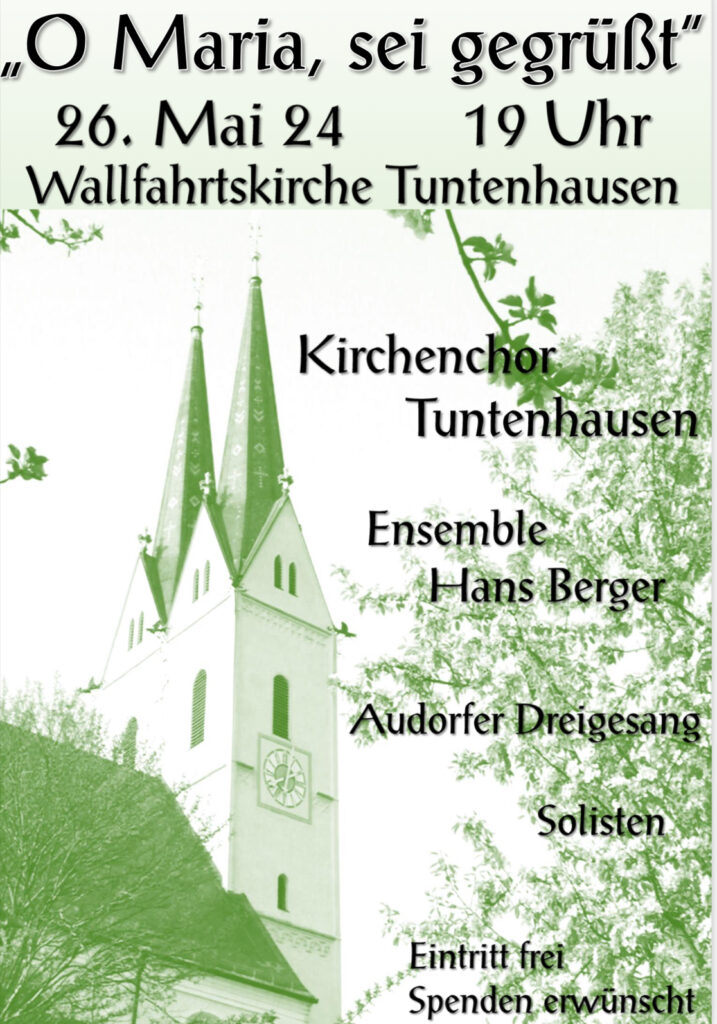 Der Kirchenchor von Tuntenhausen singt am heutigen Sonntag – 26. Mai zusammen mit Solisten, Dreigesang und Großem Ensemble um 19 Uhr in der Basilika das Marien-Oratorium von Hans Berger. Der Eintritt ist frei. Spenden sind erwünscht.