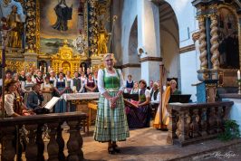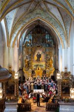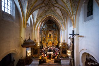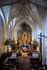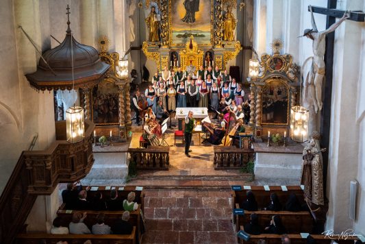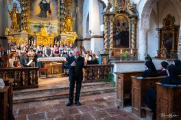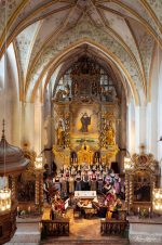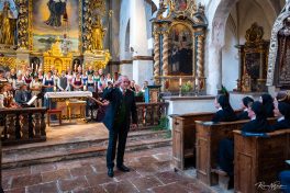 In seinen einführenden Worten erklärte der Komponist, Kirchenmusiker und Zithervirtuose Hans Berger den Konzertbesuchern kurzweilig das Programm des Marien-Oratoriums. Schon hier wurde deutlich, mit wieviel Liebe zum Detail Hans Berger die einzelnen Chor- und Instrumentalstimmen arrangiert hat. Beginnend mit der Geburt Mariens, deren Herzschlag deutlich hörbar durch den Kontrabass gemacht wird. Die Passagen aus der Heiligen Schrift wurden von Daniel Hinterberger gesungen, der in feinem, sehr deutlich artikuliertem Bariton durch das Programm führte. Sehr kurzweilig lässt der Komponist das Programm dadurch werden, dass er sehr abwechslungs- und farbenreiche Kontraste einsetzt. Ein gewichtiger Programmpunkt findet sich in der Verkündigungsszene: Maria (Martina Scharmann) ist alleine im Gebet versunken und wird vom Engel (Traudi Seebacher) heimgesucht, der ihr verkündet, dass sie die Mutter des Erlösers sein soll. Dieses interessante Zwiegespräch wird vom Frauenchor in der Erzählerrolle vervollständigt. Völlig klar in der Sprache und Intonation erstrahlte der Männerchor, der mit dem Solisten Daniel Hinterberger die Geschichte vom Heiligen Josef erzählte. Passend zur Klosterkirche Frauenwörth erklang der gregorianische Gesang des Frauenchors, die das Magnificat darbrachten. Im Volksgesang mit den Besuchern ertönte der Kehrvers: „Danket dem Herrn, er hat uns erhöht: Großes hat er an uns getan!“ Im Leben Mariens nimmt das Fest Weihnachten einen hohen Stellenwert ein. Sehr still und andächtig wurde es, als der angenehme Dreigesang mit Traudi Seebacher, Birgit Sporer und Anni Pichler das Lied „Heiliges ist hier geschehen“ zu Gehör brachten. Das freudige Gloria wurde vom großen Montini-Chor angestimmt, der die altehrwürdige Klosterkirche zum Klingen brachte. Ein weiterer Dreigesang bestehend aus Martina Scharmann, Rosi Vinzenz und Marianne Huber luden die Konzertbesucher zur Marienverehrung im „O Maria, sei gegrüßt“ ein. Abschließend wurden noch einmal alle Register gezogen, in der Danksagung dafür, dass Maria auserkoren wurde, den Heiland zu gebären, der der Welt den Frieden bringt. Tosender und langanhaltender Applaus zeigte die Begeisterung, die vom ersten Herzschlag Mariens bis hin zum Schlussakkord auf das Publikum überging. Hans Berger bedankte sich mit der Zugabe „Weit ist das Meer“ (Text Georg Thurmair).