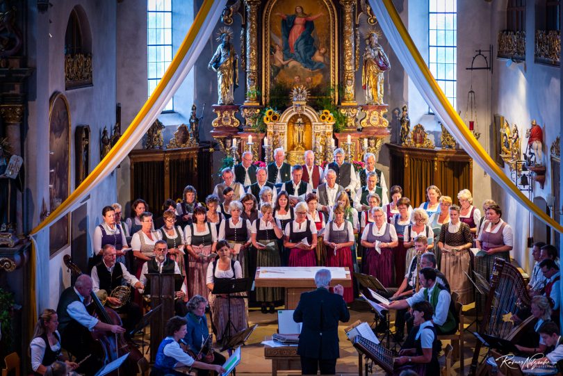 „Glocken und ihre Klänge waren schon in meiner Kindheit von großer Bedeutung, als Zehnjähriger faszinierten mich schon Ross- und Kuh-Geschirre mitsamt ihren Glocken“ – so Hans Berger, der unter den Gästen auch viele Ehrengäste (unter anderem Diakon Günter Schmitzberger sowie Volksmusik-Kenner aus der Steiermark) begrüßen konnte. Eingangs des volksmusikalischen Abends hieß Pfarrgemeinderats-Vorsitzender Christoph Prankl die Besucher willkommen und er sagte dabei: „Es ist eine gute Wahl und stimmige Sache am Festtag von Maria Himmelfahrt in unserer schönen Kirche zum Patrozinium einen Konzertabend mit Hans Berger und dessen Musikanten und Sänger anzubieten“. Erklärend ergänzte Prankl, dass ein Oratorium die Vertonung einer geistlichen Handlung ist, wogegen sich bei Opern weltliche Ereignisse musikalisch darstellen lassen. Den Auftakt des Alpenländischen Marien-Oratoriums in Törwang mit Musik von Hans Berger galt den Eltern von Maria, Anna und Joachim und somit der Geburt Jesu. Im Laufe des Programmes, das Hans Berger als tirolerische-bayerische-samerbergerische Gemeinschafts-Veranstaltung bezeichnete, wurden auch die Gläubigen in den Gesang einbezogen.