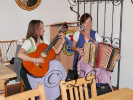 Kniend: Steffi Wimmer und Frieda Viehhauser, Musikantinnen aus Bergern