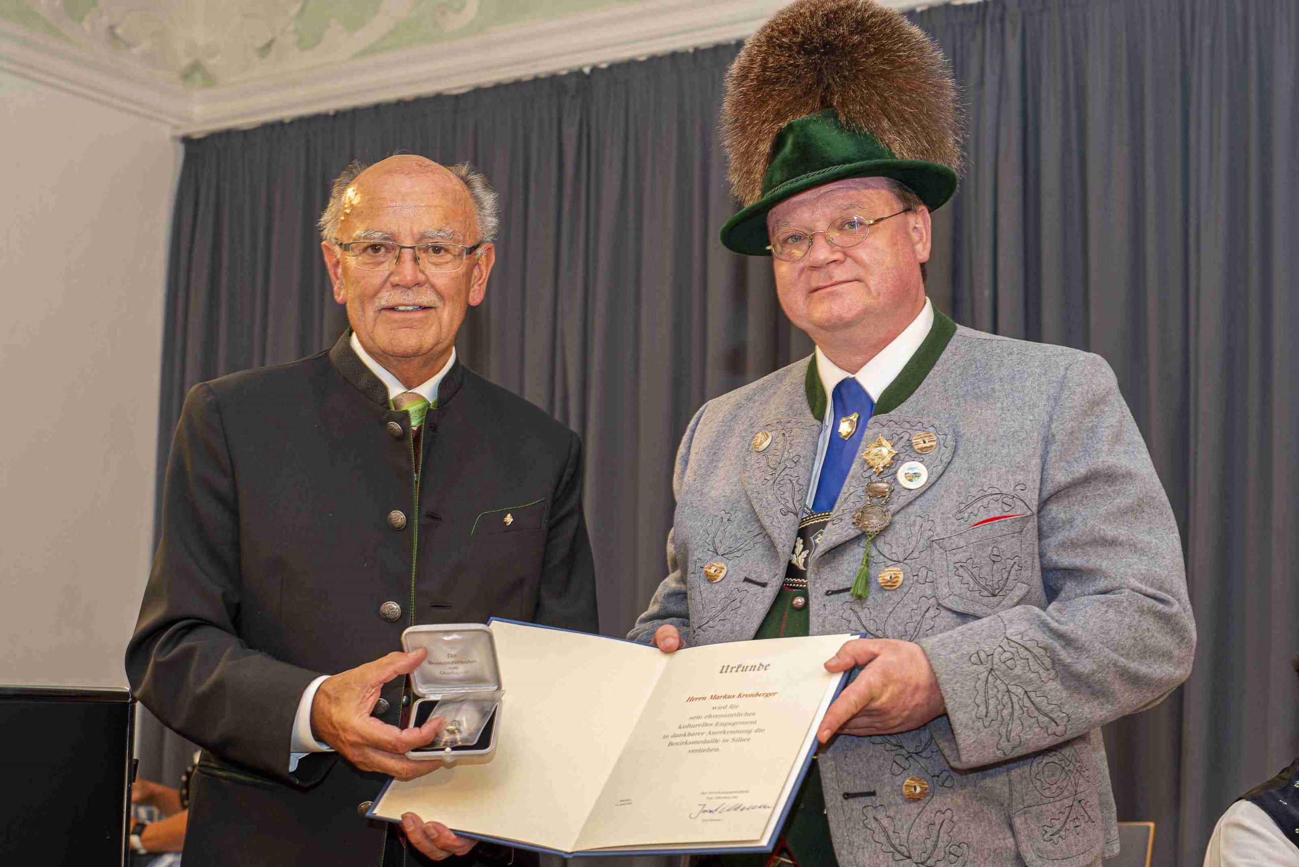 Bezirkstagspräsident Josef Mederer (links) überreichte die Bezirksmedaille an Markus Kronberger.
