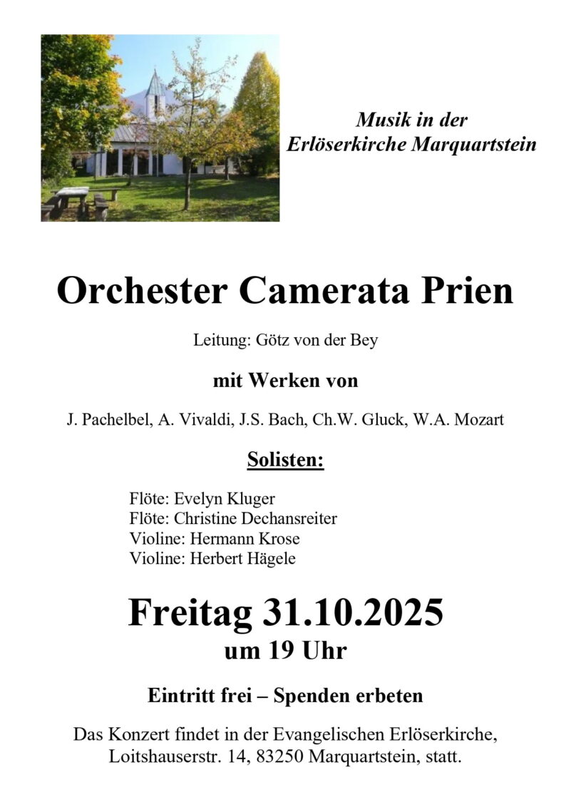 Am Freitag, 31. Oktober findet in der Evangelischen Erlöserkirche, Loitshauserstr. 14 um 19 Uhr ein Konzert statt. Das Orchester Camerata Prien unter Leitung von Götz von der Bey spielt Werke von J. Pachelbel, A. Vivaldi, J.S. Bach, Ch.W. Gluck und W.A. Mozart.