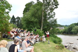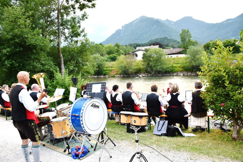 Eine besondere Location hatte sich die Musikkapelle Marquartstein für ihr Standkonzert ausgesucht, ganz romantisch am Ufersaum der Ache. Auch auf der gegenüberliegenden Seite hatten sich Zuhörer niedergelassen, sie wurden mit Ansagen und winken ins Geschehen einbezogen.