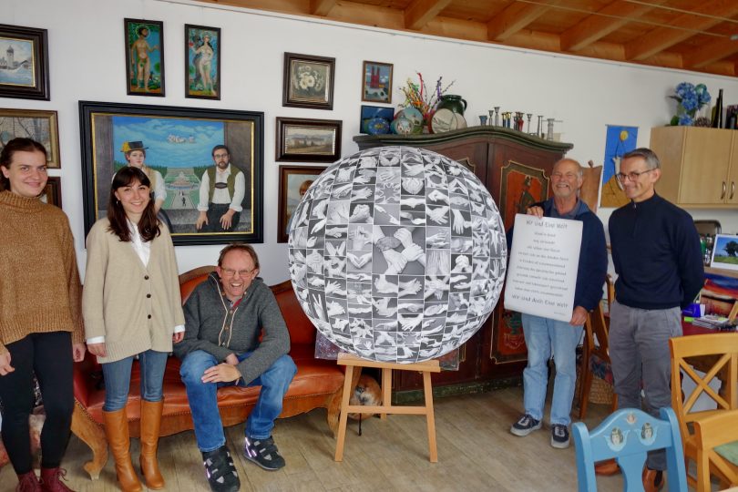 Bilderserien mit Augenpaaren, mit Priener Haustüren, mit Mitfahrern im Lift des Hauses „Leben mit Handicap“, das Mathias Stampfl selbst bewohnt, haben immer wieder zu Aufmerksamkeit und Ausstellungen geführt. Sein jüngstes Kunstwerk aus einer Reihe von Händen fand nicht nur den Gefallen in der Priener Pfarrkirche, in der Taufkapelle im Rahmen der „Priener Kunstzeit“ und beim Rosenheimer Landratsamt, sondern auch vom Bayerischen Staatsminister für Wissenschaft und Kunst Markus Blume. Der Landtagsabgeordnete schrieb unter anderem an die Familie Stampfl: „Das Alte Schloss Schleißheim beherbergt ein Zweigmuseum unseres Bayerischen Nationalmuseums. Die dort gezeigte beeindruckende interreligiöse und interkulturelle Dauerausstellung zur Fest- und Alltagskultur passt meines Erachtens bestens zum Werk Händekugel“. Aufgrund dieser Empfehlung machte sich Dr. Thomas Schindler, Referent für Volkskunde im Bayerischen Nationalmuseum zusammen mit den Praktikantinnen Judith Becki und Marie-Theres Wandinger auf den Weg nach Prien, um mit Mathias Stampfl und seiner Mutter Helga Näheres zu besprechen. Schnell war man sich zusammen mit dem Priener Verserlschreiber Ernst Reiter (Er verfasste dazu das Gedicht: „Wir sind eine Welt“) einig, den Wunsch des Ministers umzusetzen und zunächst die organisatorischen und technischen Voraussetzungen zu planen. Mathias Stampfl freute sich sichtlich, hatte er doch mit seiner Familie und den Freunden der Familie eineinhalb Jahre am Kunstwerk „Hände“ gearbeitet. Die Ausstellung im Alten Schloss Schleißheim soll im kommenden Jahr erfolgen.