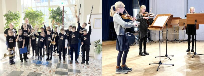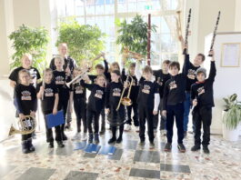 Auch das Quartett mit den vier Cellistinnen (Einstudierung Monika Gaggia) – eine davon eine bewundernswerte Linkshänderin am Cello – zeigte mit „Palladio“ von Karl Jenkins (geb. 1944) mit höchster Konzentration auf den einschneidenden Rhythmus fortgeschrittenes Können. Mit Ludwig van Beethovens (1770-1827) „Freude schöner Götterfunken“ und „Star Wars“ von John Williams (geb. 1932) setzten die „Klangstürmer“, das gemeinsame Kinderblasorchester der Musikschule und der Stadtkapelle, das aus den Bläserklassen der letzten Jahre hervorging, unter der Leitung von Anne Friedl-Henneberger den temperamentvollen Schlusspunkt.