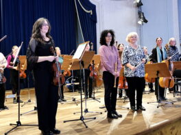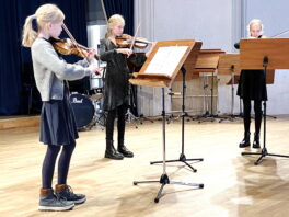 Die folgenden Ensembles zeigten, dass diese Vorschusslorbeeren absolut verdient waren. Das Flötenensemble mit Klavier und Kontrabass wird betreut von Gertrud Krebs und erfreute mit einem Landler und mit einer besonderen Bearbeitung des Beatles-Songs „Yesterday“ mit variationsreichen Verzierungen am Klavier und einer harmonischen Zweistimmigkeit der Flöten auf dem verlässlichen Fundament des Kontrabasses. Das Trio aus drei Violinen wird von Sladjana Curović unterrichtet und spielte klangschön und eindrucksvoll in der Darbietung die Czardas-Momente in „Schwarzer Sonntag“ von Ernst-Thilo Kalke (1924-2018). Mit diesem Stück hatten die drei jungen Geigerinnen auch beim BGL-Wettbewerb erfolgreich teilgenommen. Wenn man die Augen schloss, hatte man hier keine 13-jährigen Mädchen vor sich, so außergewöhnlich war der Klang. Auch das beeindruckende Streichorchester musiziert unter der Leitung von Sladjana Curović, die allerdings nicht als Dirigentin auftrat, sondern die Leitung des Menuetts von Georg Friedrich Händel (1685-1759) und des Jägerchors von Carl Maria von Weber (1786-1826) in die Hände der jungen Konzertmeisterin Magdalena Färber gelegt hat, die auch schon beim Geigentrio überzeugt hatte. Das musikalische Fundament lieferte wie schon beim Flötenensemble das Klavier.