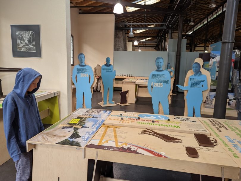 Weiter geht es mit dem Faktor Mensch: Am Beispiel des Kaufs eines T-Shirts und des Zusammenstellens eines Frühstücks wird gezeigt, wie wir im Kleinen Einfluss auf unseren CO2 Ausstoß haben. Aber auch das Einstellen der Heizung spielt eine große Rolle. Was braucht es dazu? Man muss den inneren Schweinehund überwinden und deshalb kann man sich an einer Station eine Schweinehundkarte mit einem guten Vorsatz stempeln. Danach erfährt man interaktiv mehr über den Temperaturunterschied zwischen einem klassischen Stadtviertel und einem Viertel mit vielen kleinen Grünflächen inkl. Fassadenbegrünung. Den Abschluss macht eine interaktive Europakarte, in der man sehen kann, dass London im Jahr 2050 wahrscheinlich das Klima von Barcelona haben wird, Hamburg das von San Marino oder München das von Mailand. Ja, wir sollten unseren Kleinkindern den Mittagsschlaf gar nicht mehr abgewöhnen. Denn wenn sie erwachsen sind, werden sie sowieso wieder eine Siesta machen, da es Mittags, im Sommer, wahrscheinlich zu heiß zum arbeiten ist ;).