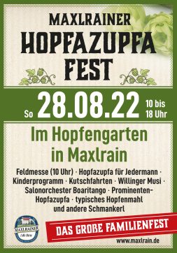 Bei dem beliebten Familienfest erwartet Sie ein abwechslungsreiches Programm rund um den Hopfen:  Um 10 Uhr findet der traditionelle Feldgottesdienst statt. Anschließend gibt‘s kesselfrische Weißwürste und Maxlrainer Bier mit viel Musi.  Ab 11 Uhr zeigen Ihnen die Hopfenbäuerinnen und Hopfenbauern, wie man richtig „hopfazupft“. Es folgt das „Prominenten-Hopfazupfa“. Ab Mittag gibt es feine, typische Hopfenschmankerl sowie ein Rahmenprogramm mit viel Musi, Tanz und guter Stimmung. Und natürlich können Sie Ihren gezupften Hopfen mit nach Hause nehmen oder einen der kunstvollen Hopfenkränze, die zum Kauf angeboten werden. Das Fest endet gegen 18 Uhr. Der Eintritt ist frei.