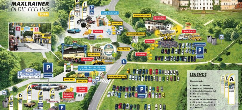 Bei gutem Wetter ist mit bis zu 15.000 Besuchern und rund 4000 Oldtimern zu rechnen – insofern hoffen Veranstalter und Oldtimer-Begeisterte auf eine weitere Verbesserung der Wetterprognose, damit das Maxlrainer Oldie Feeling auch zu seinem 25. Jubiläum wieder zum einzigartigen Erlebnis wird. Oldtimer, die 40 Jahre und älter sind, erhalten einen kostenlosen Parkplatz auf der Schlosswiese, jüngere Oldtimer können von den Besuchern auf einer Sonderfläche in Mietraching bewundert werden. Das Areal ist zudem in elf Themenparks unterteilt: von einer Sonderschau für Zweiräder über Trabant, Fiat X 1/9, Fiat 124 Spider, Porsche 356 bis hin zu Triumph-Roadster TR2 bis TR8 und älter, Audi Urquattros und Triumph Spitfire. Ebenso präsentieren das Technische Museum BGS Rosenheim, die Classic Cars Munich GmbH und der Automobil-Club München von 1903 zahlreiche Raritäten. Im oberen Bereich der Schlosswiese gibt es Livemusik und einige Köstlichkeiten. Auch auf dem Brauereiplatz herrscht buntes Treiben und die kleinsten Besucher dürfen sich auf die ADAC Kinderwelt mit Attraktionen freuen. In der ADAC Welt kann man am 17:30 SAT.1 Bayern-Glücksrad tolle Preise gewinnen, darunter einen ADAC Reisegutschein im Wert von 1000 Euro, Tagestickets für den Allgäu Skyline Park und die Bavaria-Filmstadt, Tickets für das Festspielhaus Neuschwanstein oder Gutscheine für Fahrsicherheitstrainings oder Oldtimer-Kurzgutachten. Zudem stellt sich hier auch der ADAC als Mobilitätsdienstleister mit seinen zahlreichen Serviceleistungen für seine Mitglieder und Kunden vor. Erstmals dabei sind Rennsimulatoren, mit denen die Besucher virtuell auf Zeitjagd gehen können. Ein weiteres Highlight des Tages ist der Start der 4. ADAC Maxlrain Classic.