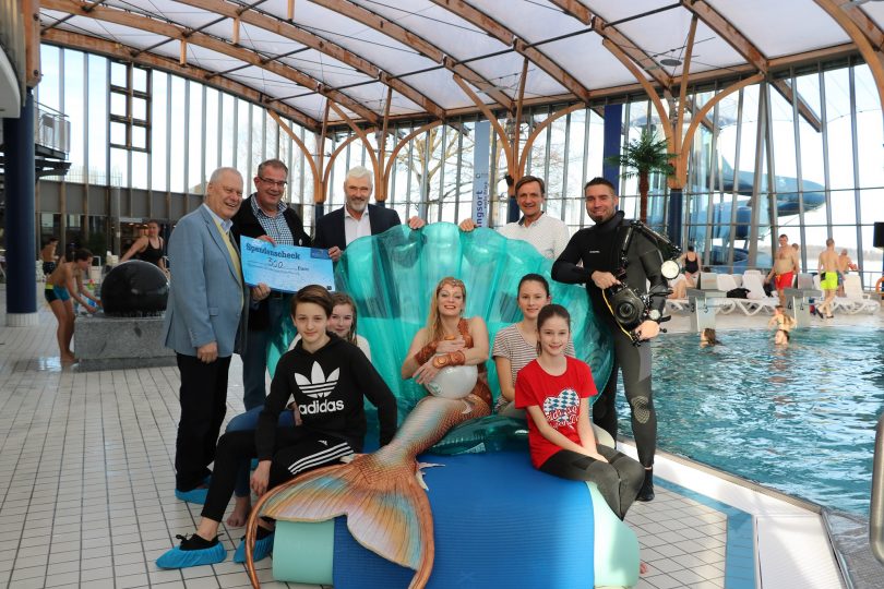 Bildunterschrift: Symbolische Scheckübergabe an den „Fischereiverein für Kinder & Jugendliche Prien e. V.“: (v.l.n.r.) 2. Bürgermeister Hans-Jürgen Schuster, 1. Vorsitzender des Fischereivereins Hartmut Nau, Geschäftsführer der Chiemsee Marina GmbH Dirk Schröder, Betriebsleiter des Prienavera Erlebnisbades Andreas Freier, Unterwasserfotograf Georg Erdmann und mittig im Bild vorne, umringt von Kindern des Fischereivereins, Profimeerjungfrau Daniela Rodler.
