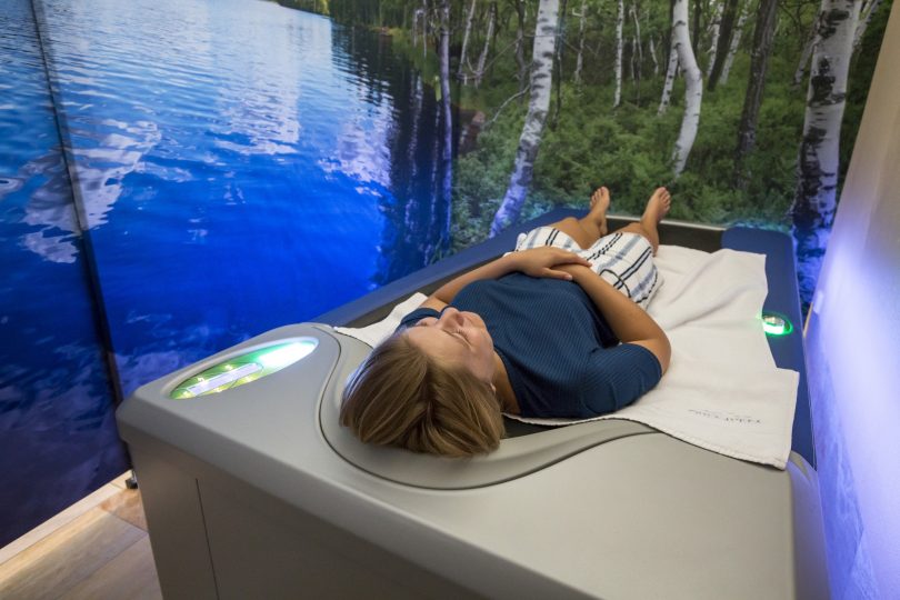 Bildunterschrift: Auf Knopfdruck genießt man zwischen den Saunagängen im Prienavera Erlebnisbad die wohltuende Wirkung der Überwasser-Massageliege.