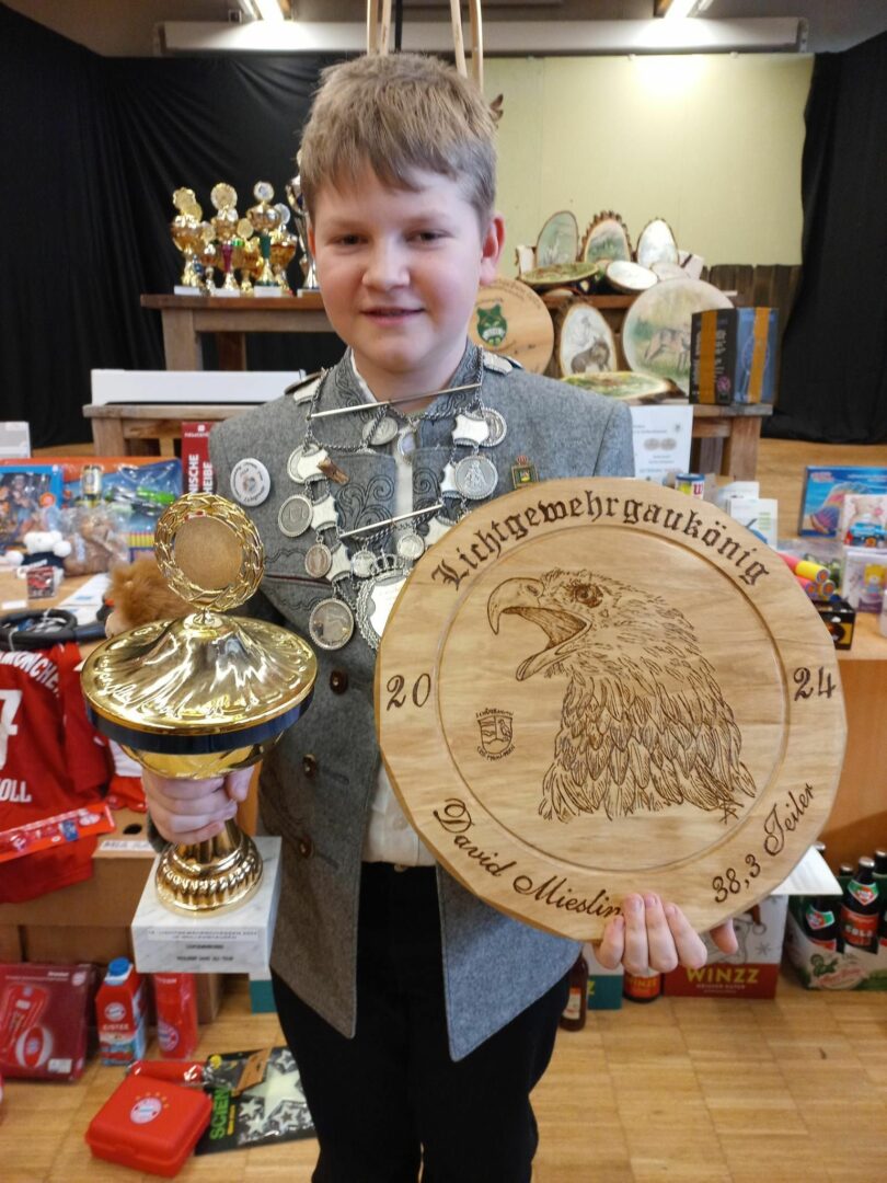 Zum Foto: David Mieslinger von der SG Endorf mit der Siegerscheibe Lichtgewehrkönig 2024