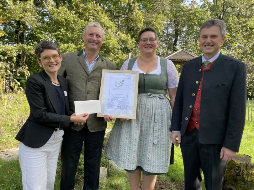 Bildunterschrift: von rechts nach links: Teresa Lukaschik (LVÖ-Bildungsreferentin), Josef Bodmaier (LVÖ Vorstand), Selina Heim (Preisträgerin), Dr. Stefan Gabler (Leiter Landwirtschaftsschule Weilheim)