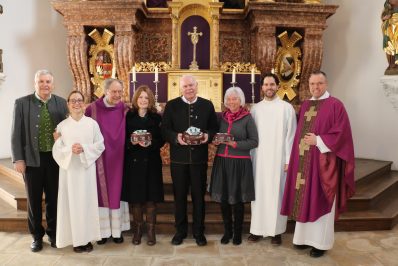 Seit 40 Jahren ist Walter Genzinger (Mitte) Mesner in der Pfarrkirche „Darstellung des Herrn“ in Aschau, die beiden Pfarrsekretärinnen Rita Metzger (links daneben) und Regina Schlemer (rechts daneben) stehen seit 25 Jahren im Dienst der Pfarrgemeinde.