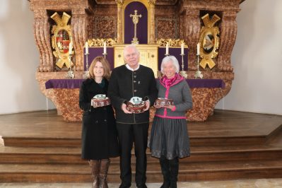 Seit 40 Jahren ist Walter Genzinger (Mitte) Mesner in der Pfarrkirche „Darstellung des Herrn“ in Aschau, die beiden Pfarrsekretärinnen Rita Metzger (links) und Regina Schlemer (rechts) stehen seit 25 Jahren im Dienst der Pfarrgemeinde
