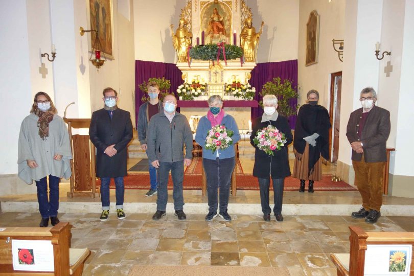 Foto/s: Hötzelsperger – 1. Verabschiedung der Wildenwarter Mesnerinnen von links: PGR-Vorsitzende Anita Aicher, Verwaltungsleiter Matthias Wicha, Ober-Ministrant Simon Aicher, PGR-Vorsitzender Peter Huber, Mesnerin Rita Stoib, Mesnerin Karin Riepertinger, Gemeindereferentin Ursula Stacheder und Kirchenpfleger Franz Riesinger als Vertreter der Kirchenverwaltung.