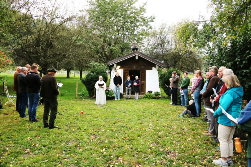 Mit Handwerkerfreunden, wie Michael Brunner, fertigte er den Gedenkort in unmittelbarer Nähe seines Anwesen. 1990 war Fertigstellung und Einweihung. Knapp 50 gläubige fanden sich heuer zu Andacht ein, begrüßt mit Glockengeläut, begleitet von einer Bläsergruppe der Neubeurer Musikanten,und Gemeinderefrentin Gundula Langer-Kochinke. Sie blickte auf die bedrückende weltpolitische Lage mit Unruhen und Kriege. Dieser Friedensort soll erinnern, an das Geschehen,warum es diese Kapelle gibt, verbunden mit dem Dank an die erlebte friedvolle Zeit, die es gilt zu bewahren. Den zahlreich anwesenden Michael usw. galten die Glückwünsche der Gäste.