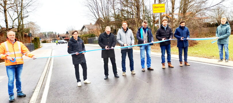 Bei der offiziellen Freigebung der Kreisstraße schnitten (von links) Johannes Bauer von der Firma Swietelsky, der die Bauleitung Tiefbau inne hatte, das symbolische weiß/blaue Band durch, stellvertretender Landrat Andreas Danzer, Übersees Bürgermeister Herbert Strauch, Grassaus Bürgermeister Stefan Kattari, Tobias Nöhrig, Geschäftsführer der Firma SAK, und Andreas Weigand, Bautechniker der Firma BG Trauntal. Ganz links ist Gerhard Seehuber, Sachgebietsleiter Tiefbau von Landratsamt Traunstein zu sehen und ganz rechts Ferdinand van de Pas, Bauleiter Tiefbau der Firma Swietelsky.